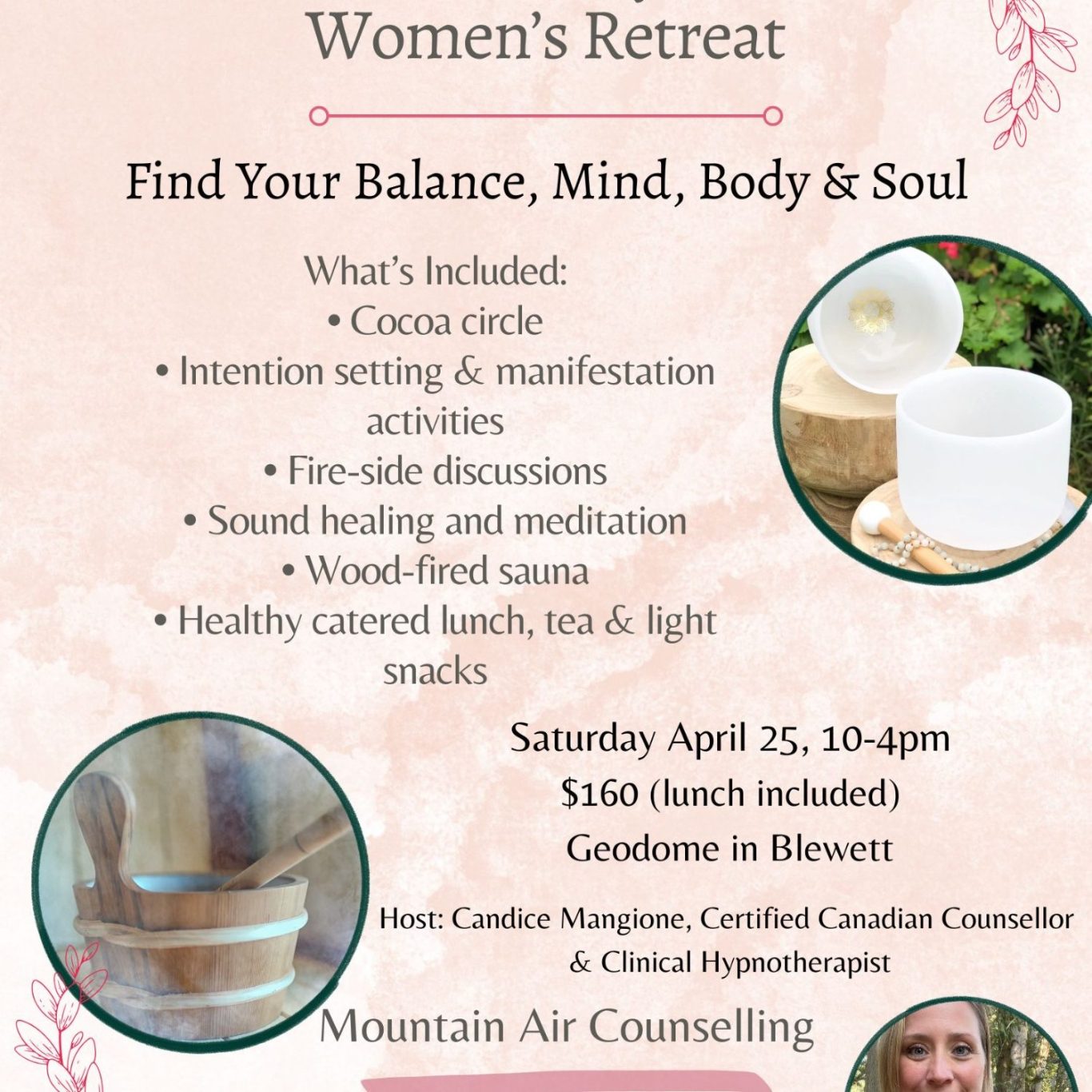Mountain Air Counselling offers one-day women’s wellness retreats throughout the year, creating a peaceful space for women to slow down, reconnect with themselves, and restore their nervous systems in nature. Set in the beauty of the Kootenays, these retreats blend nature-based therapy, guided meditations, sound healing, fireside community discussions, and quiet time for reflection. Participants are invited to unplug from the busyness of daily life and spend a nourishing day experiencing restorative practices, gentle self-inquiry, and supportive connection with other women in a calm and welcoming environment.